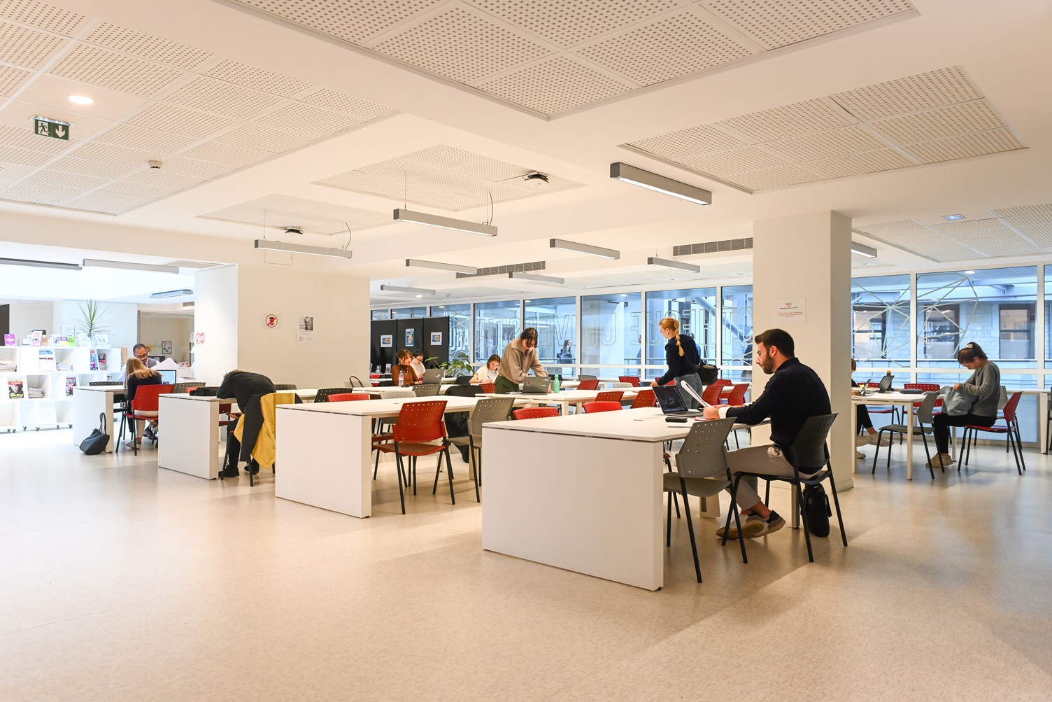 - Salle multimédia, 10 box de travail en groupe à réserver